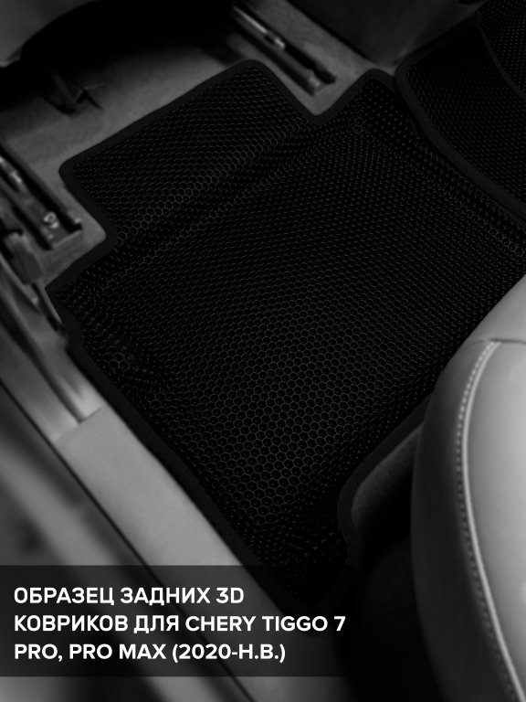 Автомобильные 3д коврики для Chery Tiggo 7 Pro I (2020-н.в.) в салон авто и багажник сделаны из инновационного полимерного материала EVA, изысканная структура в виде ячеек не дает воде, пыли и снегу разлетаться по салону машины и багажнику. 3д коврики зафиксированы на полу определенными клипсами, соответствующими Chery Tiggo 7 Pro I (2020-н.в.), и не двигаются в процессе езды.