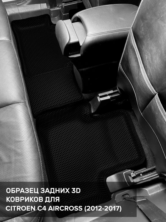 Автомобильные 3д коврики для Citroen C4 Aircross (2012-2017) в салон авто и багажник сделаны из инновационного полимерного материала EVA, изысканная структура в виде ячеек не дает воде, пыли и снегу разлетаться по салону машины и багажнику. 3д коврики зафиксированы на полу определенными клипсами, соответствующими Citroen C4 Aircross (2012-2017), и не двигаются в процессе езды.