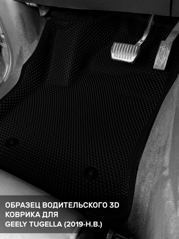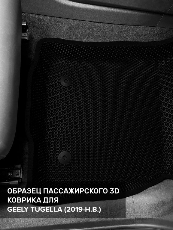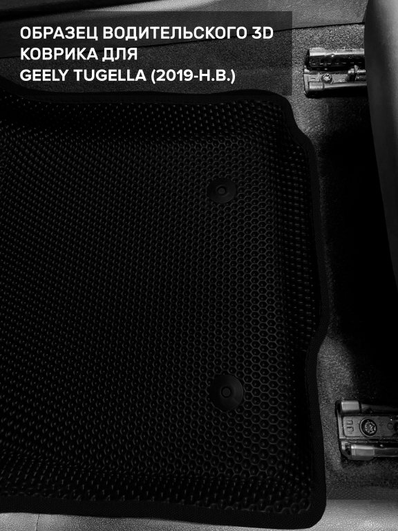 Автомобильные 3д коврики для Geely Tugella (2019-н.в) в салон авто и багажник сделаны из инновационного полимерного материала EVA, изысканная структура в виде ячеек не дает воде, пыли и снегу разлетаться по салону машины и багажнику. 3д коврики зафиксированы на полу определенными клипсами, соответствующими Geely Tugella (2019-н.в), и не двигаются в процессе езды.