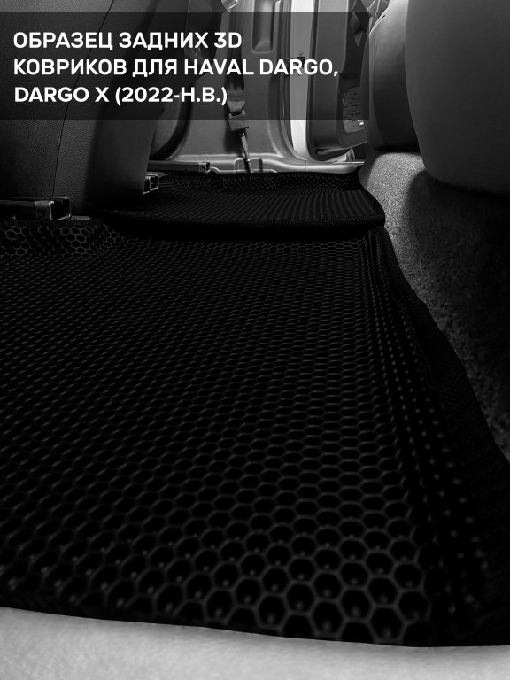 Автомобильные 3д коврики для Haval Dargo (2022-н.в.) в салон авто и багажник сделаны из инновационного полимерного материала EVA, изысканная структура в виде ячеек не дает воде, пыли и снегу разлетаться по салону машины и багажнику. 3д коврики зафиксированы на полу определенными клипсами, соответствующими Haval Dargo (2022-н.в.), и не двигаются в процессе езды.