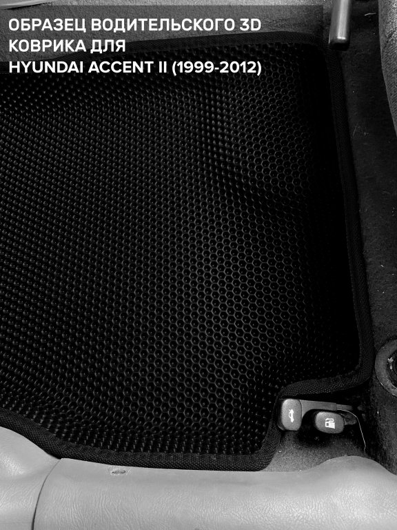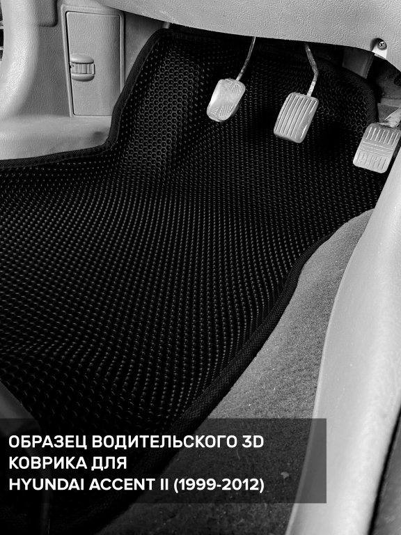 Автомобильные 3д коврики для Hyundai Accent II (1999-2012) в салон авто и багажник сделаны из инновационного полимерного материала EVA, изысканная структура в виде ячеек не дает воде, пыли и снегу разлетаться по салону машины и багажнику. 3д коврики зафиксированы на полу определенными клипсами, соответствующими Hyundai Accent II (1999-2012), и не двигаются в процессе езды.