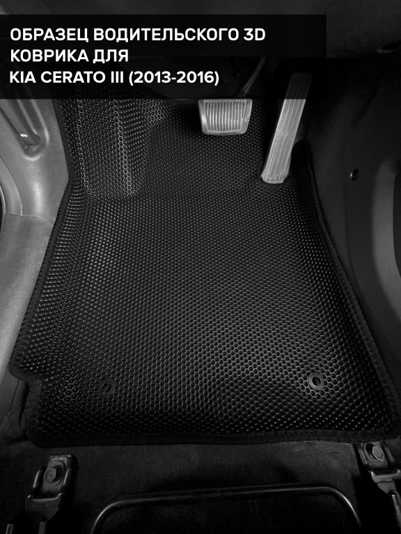 Автомобильные 3д коврики для Kia Cerato III (2013-2016) в салон авто и багажник сделаны из инновационного полимерного материала EVA, изысканная структура в виде ячеек не дает воде, пыли и снегу разлетаться по салону машины и багажнику. 3д коврики зафиксированы на полу определенными клипсами, соответствующими Kia Cerato III (2013-2016), и не двигаются в процессе езды.