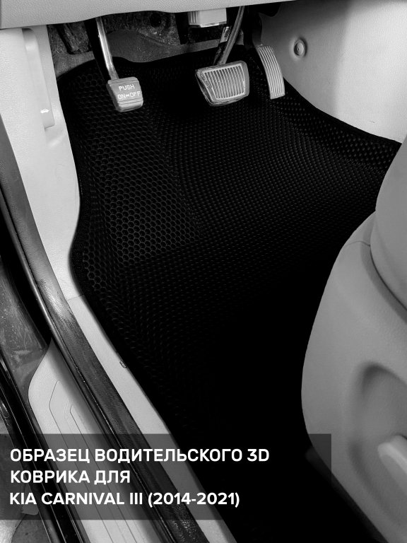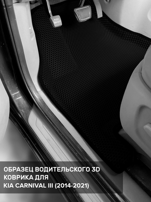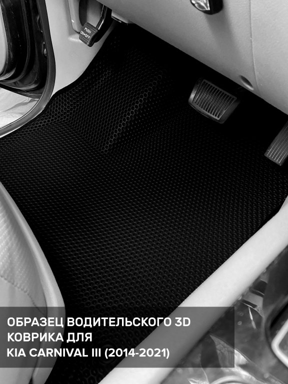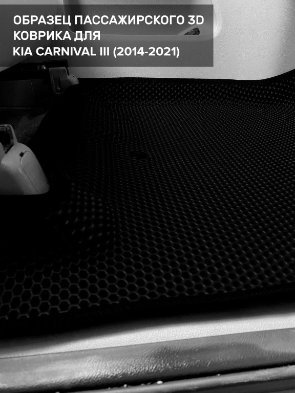 Автомобильные 3д коврики для Kia Carnival III передний ряд (2014-2021) в салон авто и багажник сделаны из инновационного полимерного материала EVA, изысканная структура в виде ячеек не дает воде, пыли и снегу разлетаться по салону машины и багажнику. 3д коврики зафиксированы на полу определенными клипсами, соответствующими Kia Carnival III передний ряд (2014-2021), и не двигаются в процессе езды.