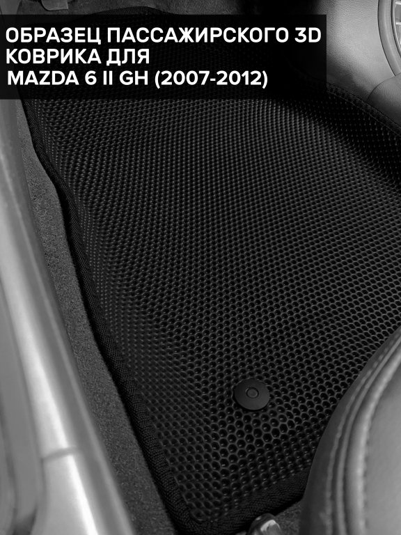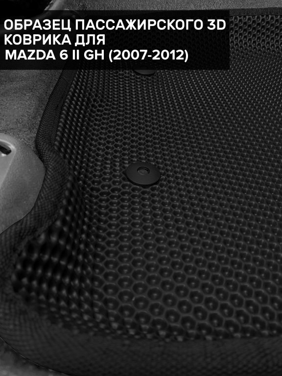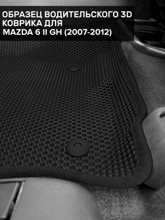 Автомобильные 3д коврики для Mazda 6 II GH седан, лифтбек, универсал (2007-2012) в салон авто и багажник сделаны из инновационного полимерного материала EVA, изысканная структура в виде ячеек не дает воде, пыли и снегу разлетаться по салону машины и багажнику. 3д коврики зафиксированы на полу определенными клипсами, соответствующими Mazda 6 II GH седан, лифтбек, универсал (2007-2012), и не двигаются в процессе езды.
