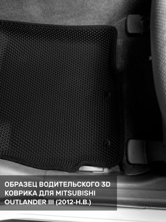 Автомобильные 3д коврики для Mitsubishi Outlander III (2012-н.в.) в салон авто и багажник сделаны из инновационного полимерного материала EVA, изысканная структура в виде ячеек не дает воде, пыли и снегу разлетаться по салону машины и багажнику. 3д коврики зафиксированы на полу определенными клипсами, соответствующими Mitsubishi Outlander III (2012-н.в.), и не двигаются в процессе езды.