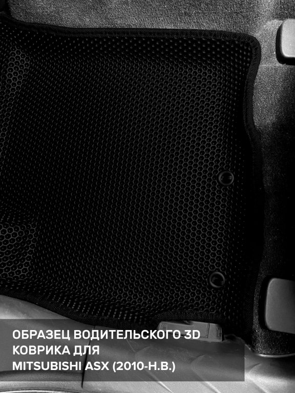 Автомобильные 3д коврики для Mitsubishi ASX (2010-н.в.) в салон авто и багажник сделаны из инновационного полимерного материала EVA, изысканная структура в виде ячеек не дает воде, пыли и снегу разлетаться по салону машины и багажнику. 3д коврики зафиксированы на полу определенными клипсами, соответствующими Mitsubishi ASX (2010-н.в.), и не двигаются в процессе езды.
