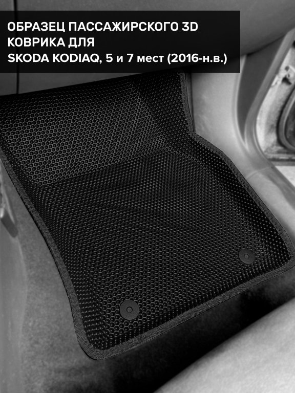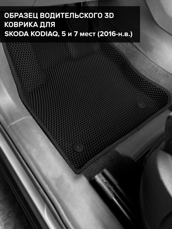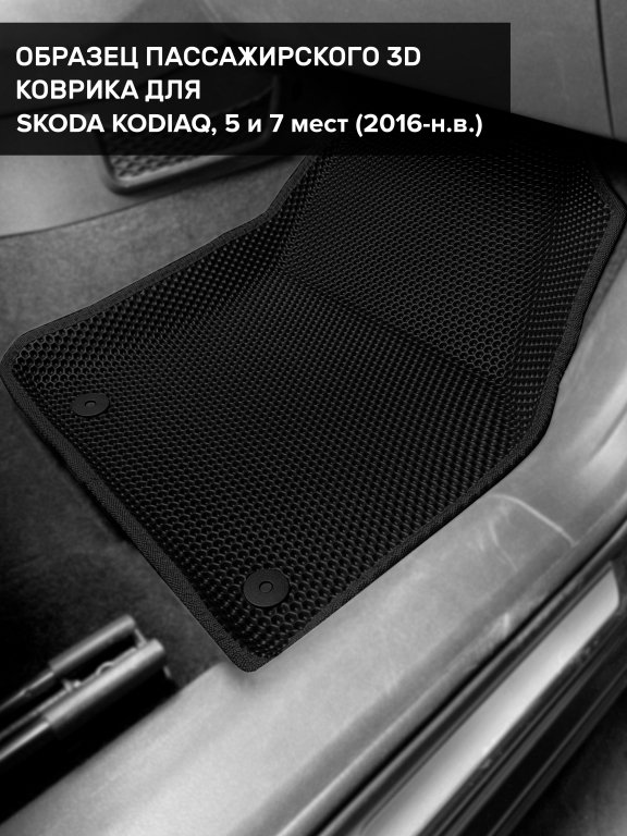 Автомобильные 3д коврики для Skoda Kodiaq I, 5 мест (2016-2025) в салон авто и багажник сделаны из инновационного полимерного материала EVA, изысканная структура в виде ячеек не дает воде, пыли и снегу разлетаться по салону машины и багажнику. 3д коврики зафиксированы на полу определенными клипсами, соответствующими Skoda Kodiaq I, 5 мест (2016-2025) , и не двигаются в процессе езды.