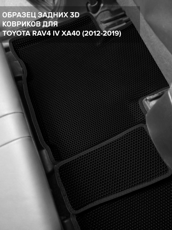 Автомобильные 3д коврики для Toyota RAV4 IV XA40 (2012-2019) в салон авто и багажник сделаны из инновационного полимерного материала EVA, изысканная структура в виде ячеек не дает воде, пыли и снегу разлетаться по салону машины и багажнику. 3д коврики зафиксированы на полу определенными клипсами, соответствующими Toyota RAV4 IV XA40 (2012-2019), и не двигаются в процессе езды.