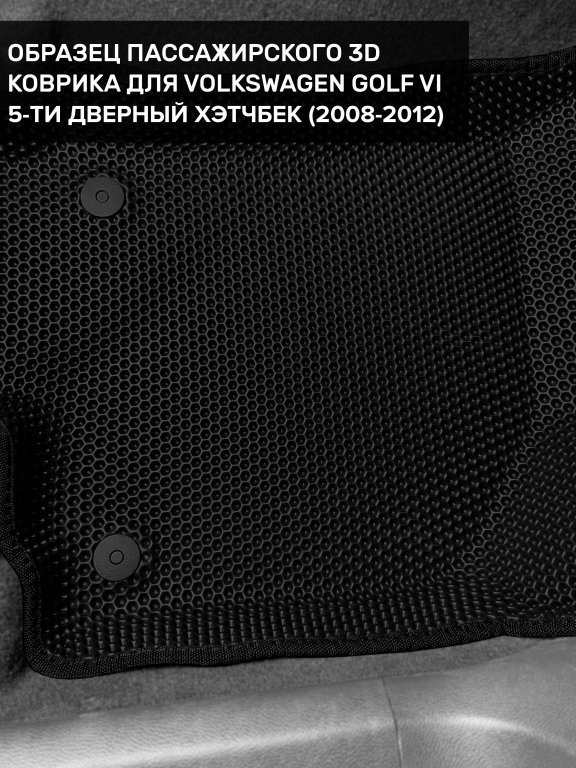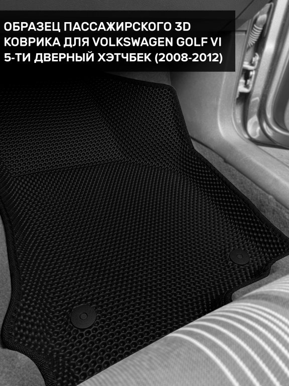 Автомобильные 3д коврики для Volkswagen Golf VI хетчбек 5D (2008-2012) в салон авто и багажник сделаны из инновационного полимерного материала EVA, изысканная структура в виде ячеек не дает воде, пыли и снегу разлетаться по салону машины и багажнику. 3д коврики зафиксированы на полу определенными клипсами, соответствующими Volkswagen Golf VI хетчбек 5D (2008-2012), и не двигаются в процессе езды.